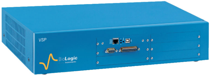 VSP多通道電化學工作站,可安裝 5 個通道。基于優秀的模塊化功能,用戶可在 VSP主機內安裝EIS 電化學阻抗通道(占一個接口)、低電流模塊(和阻抗通聯用) 以及內置 4A 大電流模塊。VSP 還可安裝外置電流擴展器,可支持100A。任意兩個通道即可組建雙恒電位儀,用于控制外部旋轉環盤裝置進行電化學研究。