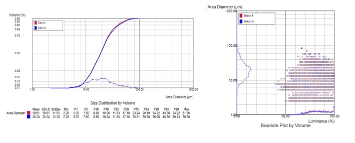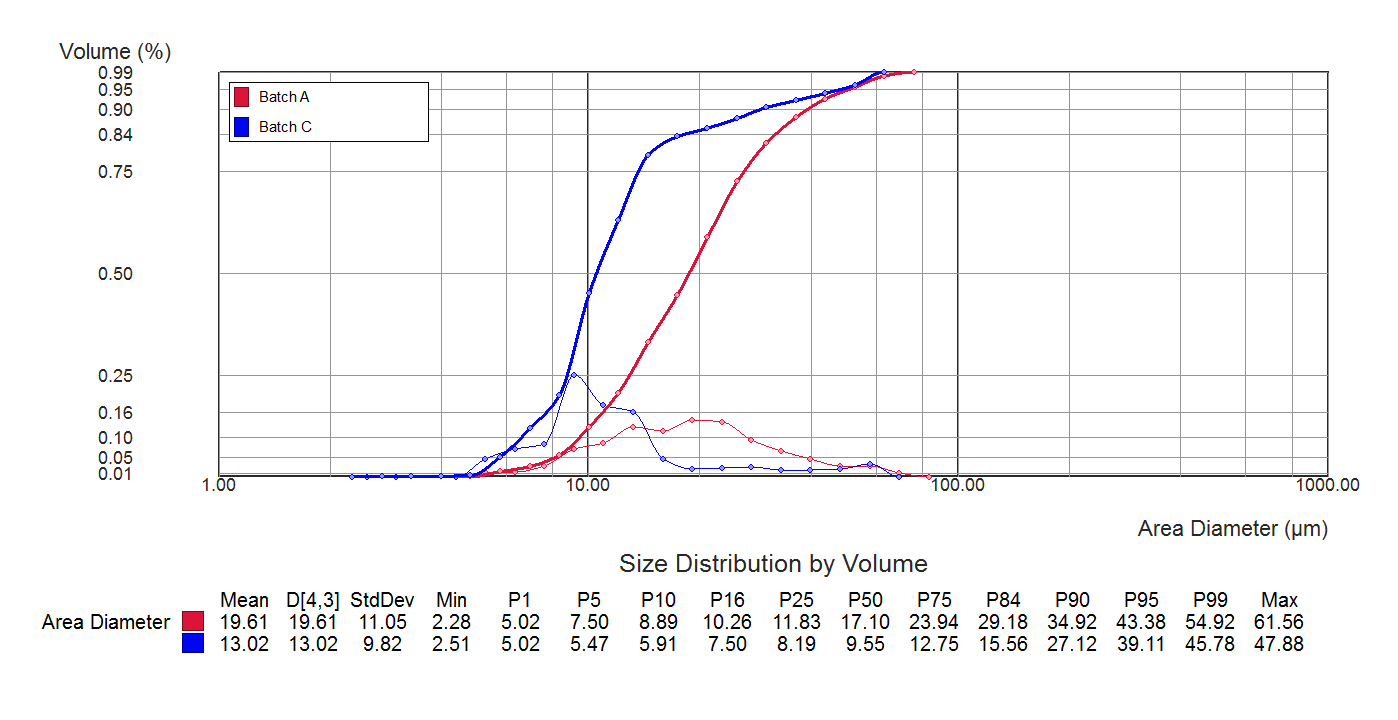 以下的比較顯示了一個(gè)不符合指標(biāo)的生產(chǎn)批次產(chǎn)品液滴粒徑產(chǎn)生重大降低。